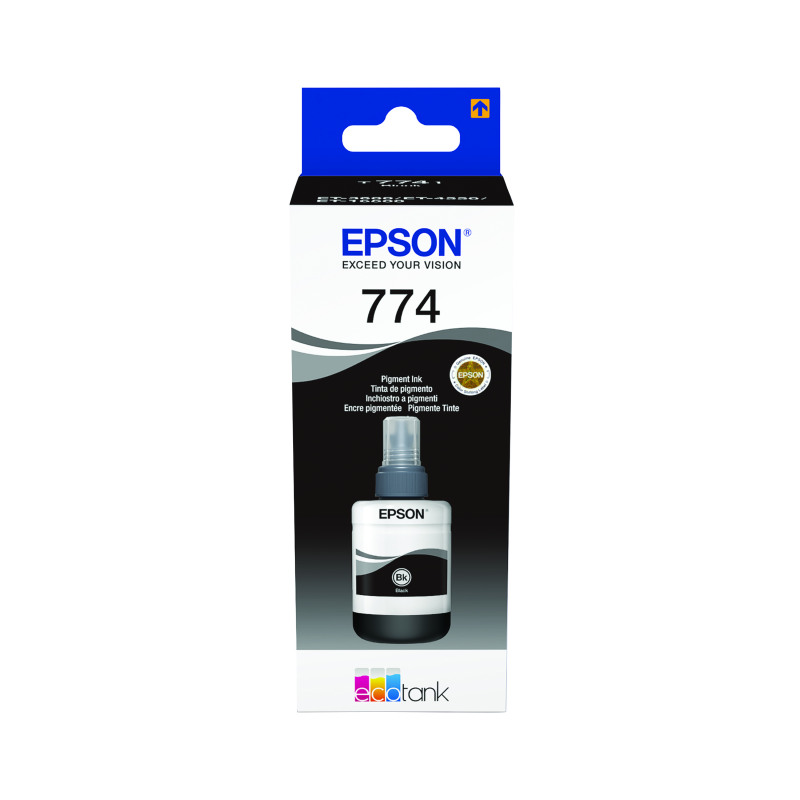 This genuine Epson ink bottle 774 provides 140ml of pigment ink for your Epson EcoTank refillable inkjet printer, providing unbeatable value-for-money compared to traditional ink cartridges. Just top up the ink tanks in your printer when required for professional quality, fade resistant documents. Page yield of up to 6,000. Compatible with Epson Eco Tank ET-4550, ET-3600, ET-16500 printers.